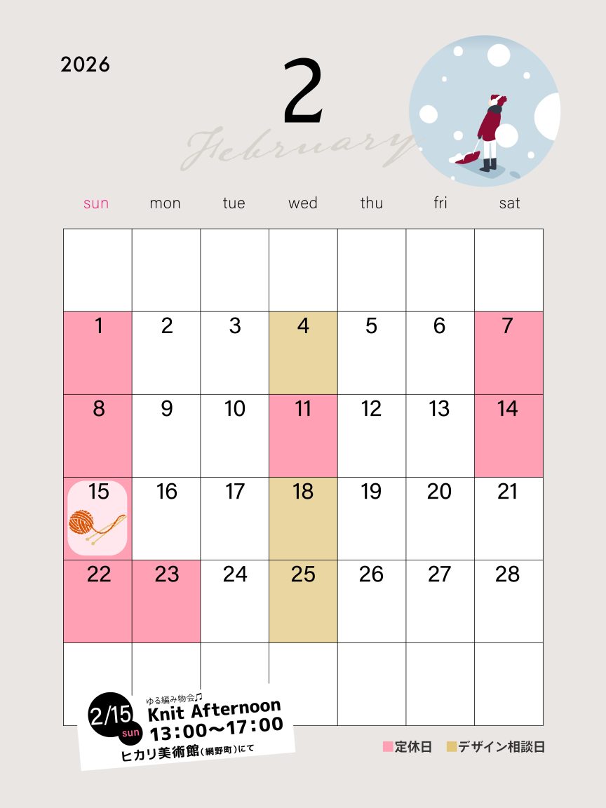 2月の「朝活 ニットモーニン」はお休みです。1月に予定しておりましたヒカリ美術館(網野町) 日曜アートカフェでの「編み物会 ニットアフタヌーン」は、2月15日(日)13時〜17時に延期となっております。ゆる〜りとした編み物会です。まっすぐ編みのワークショップも予定しています。詳細は後日お知らせします。