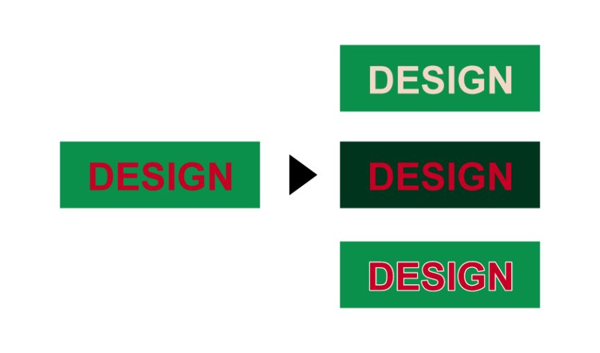色みがいくら違っても、そこに明度差がないと見にくいです。例えば、緑と赤は、色みは補色で違いますが、明度が近いため、組み合わせると視認性が低いです。解決方法としては、明度差を出すか(上段の例)、彩度差を出すか(中段の例)、色の間に異なる色を入れるといった、いわゆる「セパレーション」の手法を取り入れるか(下段の例)、、、など。これらいずれかの方法で調整し、明度差をつけます。