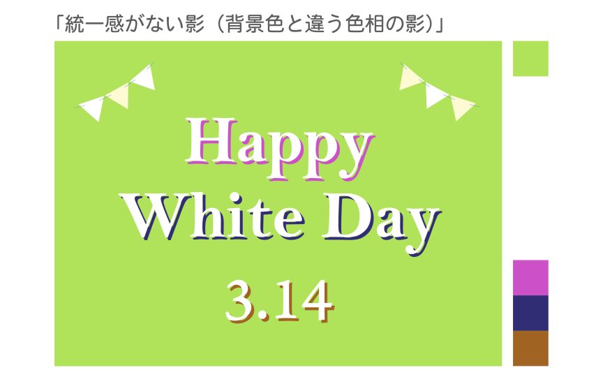 次の図は、3つの文字に背景色と違う色相(色味)の影がついています。ひとつの場面に色相の違う色が混在しているので、なんだかバラバラで統一感はあまり感じられません。