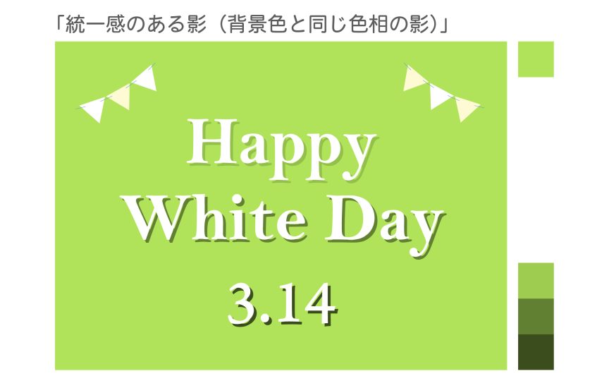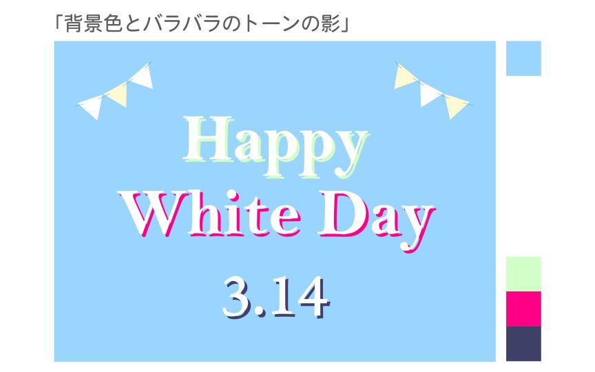 このように、「同じ色相による統一」「トーンによる統一」を意識して影の色をつけると、全体を統一感のある印象にすることができます。影色に迷ったときは、ぜひお試しください。統一感のある影づかいで文字表現の幅を広げていきましょう。