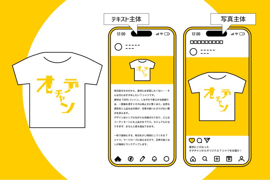 Tシャツの魅力を伝えるなら写真がいい!と思われるかもしれません。ビジュアルを推したい場合はそれでも問題ありません。しかしこだわりの素材や制作に至ったストーリーを伝えたい場合は写真を主体としたメディアでは見る側にすべてが伝わりにくいでしょう。この商品だからこのメディア!と決めつけるのではなく、発信したい内容に適したコンテンツを探しましょう。